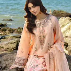 An elegant three-piece outfit adorned with intricate hand embellishments. The shirt is crafted with attention to detail, paired with a matching bottom and an embellished dupatta — perfect for celebrations and formal evenings.