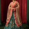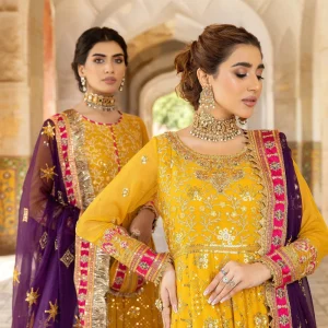 Inspired by timeless Mughal aesthetics, this heavily adorned outfit features gota, zari, and resham detailing. The ensemble adds a royal touch to bridal festivities with its flared design and luxurious fabric.