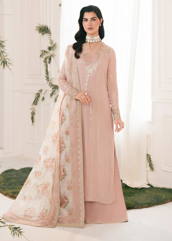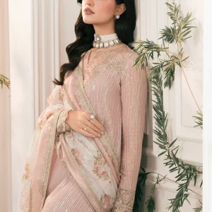 A timeless design crafted with intricate embroidery and subtle detailing. The set includes a formal shirt, trouser, and a flowy dupatta — ideal for family events, mehndi nights, or wedding receptions.